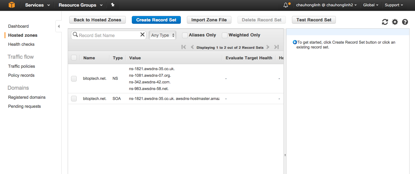 Click on "Create Hosted Zone". Enter your domain name and you will see it shows up in Hosted Zone list. Click into it, you will go into the Record Sets screen. You will see two record sets created by AWS: NS (Name Server) and SOA (Start of Authority).