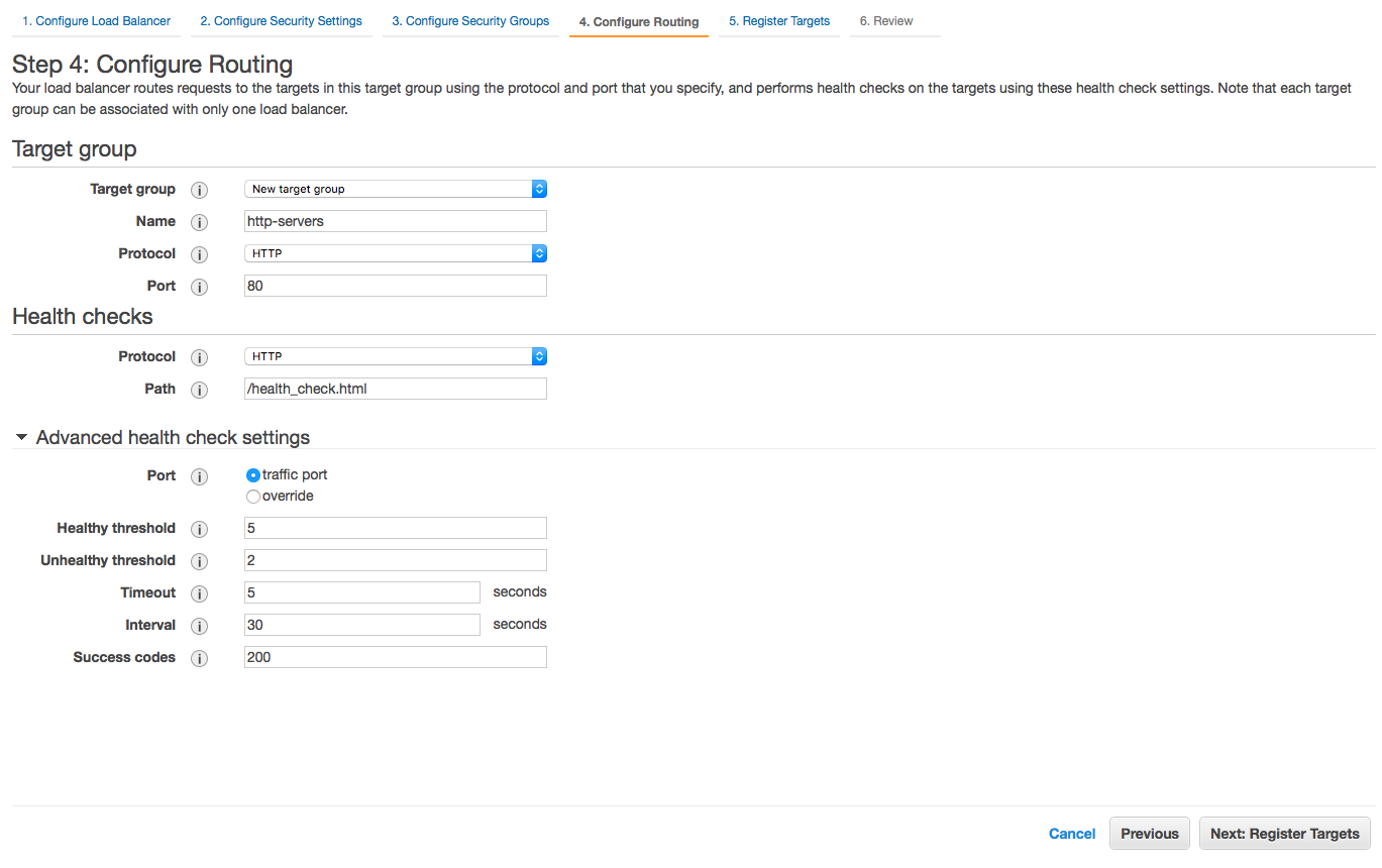 The Target Group in this case is a groups of EC2 instances that have nginx running on them. Therefore I choose Protocol HTTP and port 80. You can setup a bunch of EC instances, each of them runs a Rails application on port 3000, so you can set Protocol HTTP and port 3000. On each instance, you must have a Health check endpoint. In my case, I create a file called health_check.html in nginx's html directory.