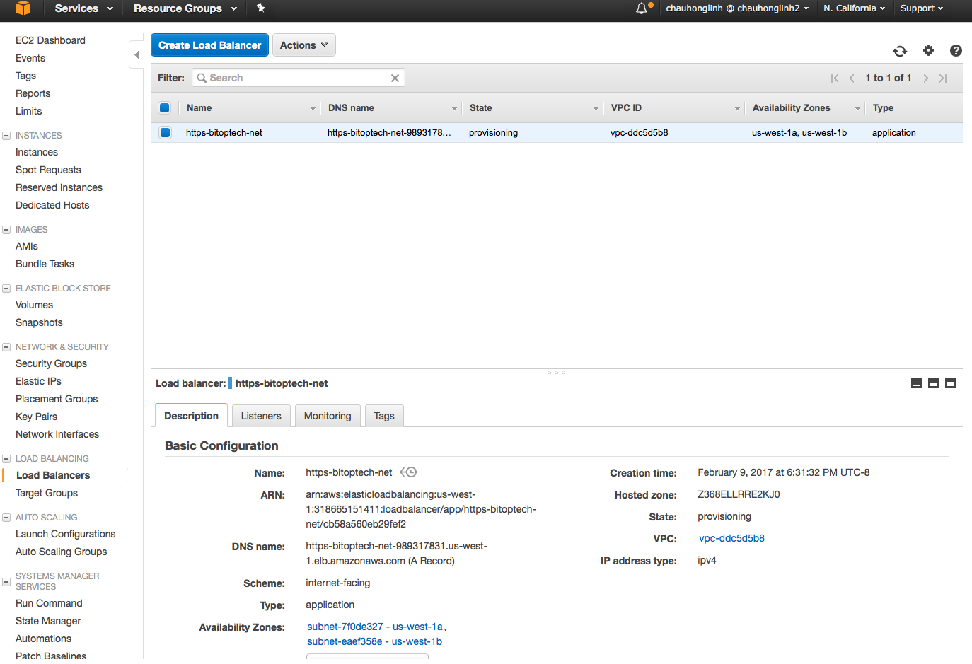 Click on "Next: Review". After carefully reviewing the settings, click on "Create", you should see a message says that the ELB is created successfully. If you go back to EC2/Load Balancers, you should see the newly created ELB is in the state "provisioning":