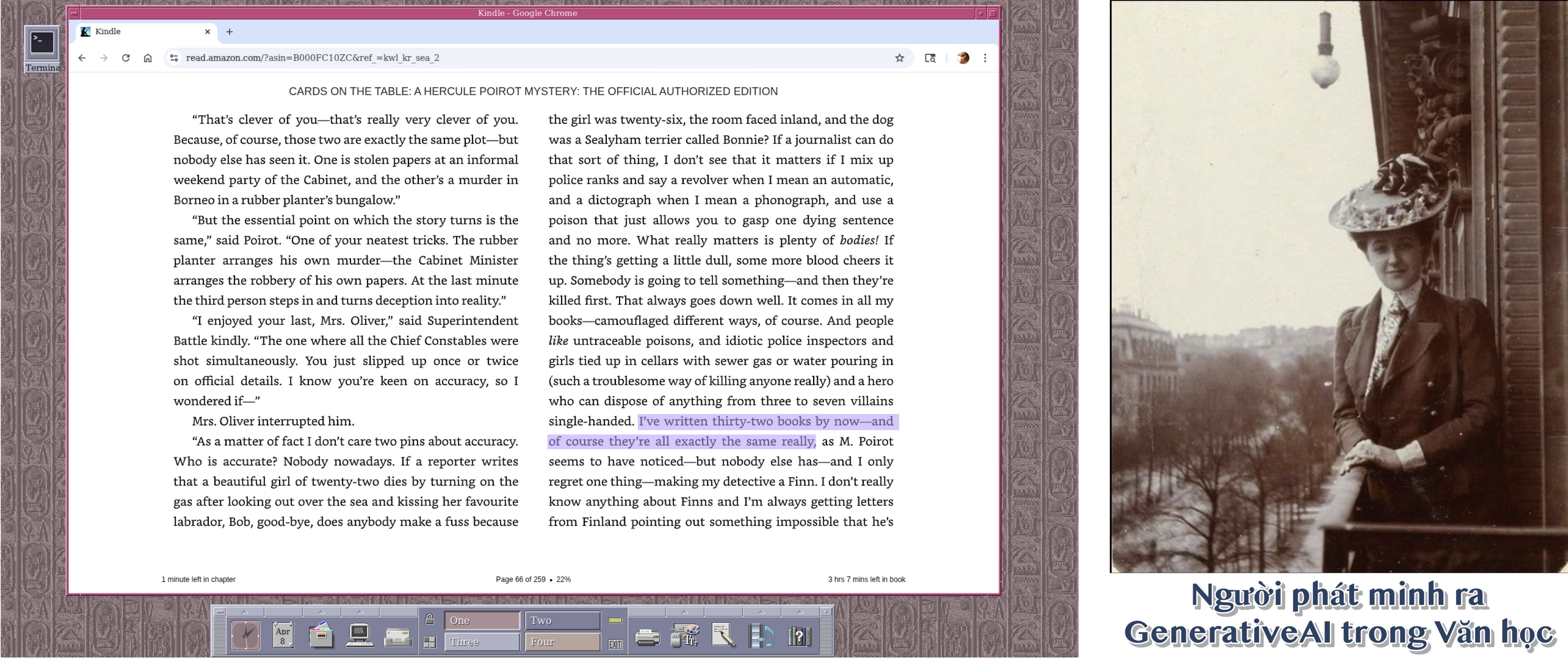 Quay lại vấn đề Generative AI. Trong ảnh bên phải là Agatha Christie, một nhà văn người Anh, cả đời đã viết 66 tiểu thuyết và 14 tập truyện ngắn, chủ yếu về thể loại trinh thám, và nhân vật thám tử chính của bà là Hercule Poirot. Em còn thích tư duy logic của lão Poirot này hơn cả Sherlock Holms của Conan Doyle.