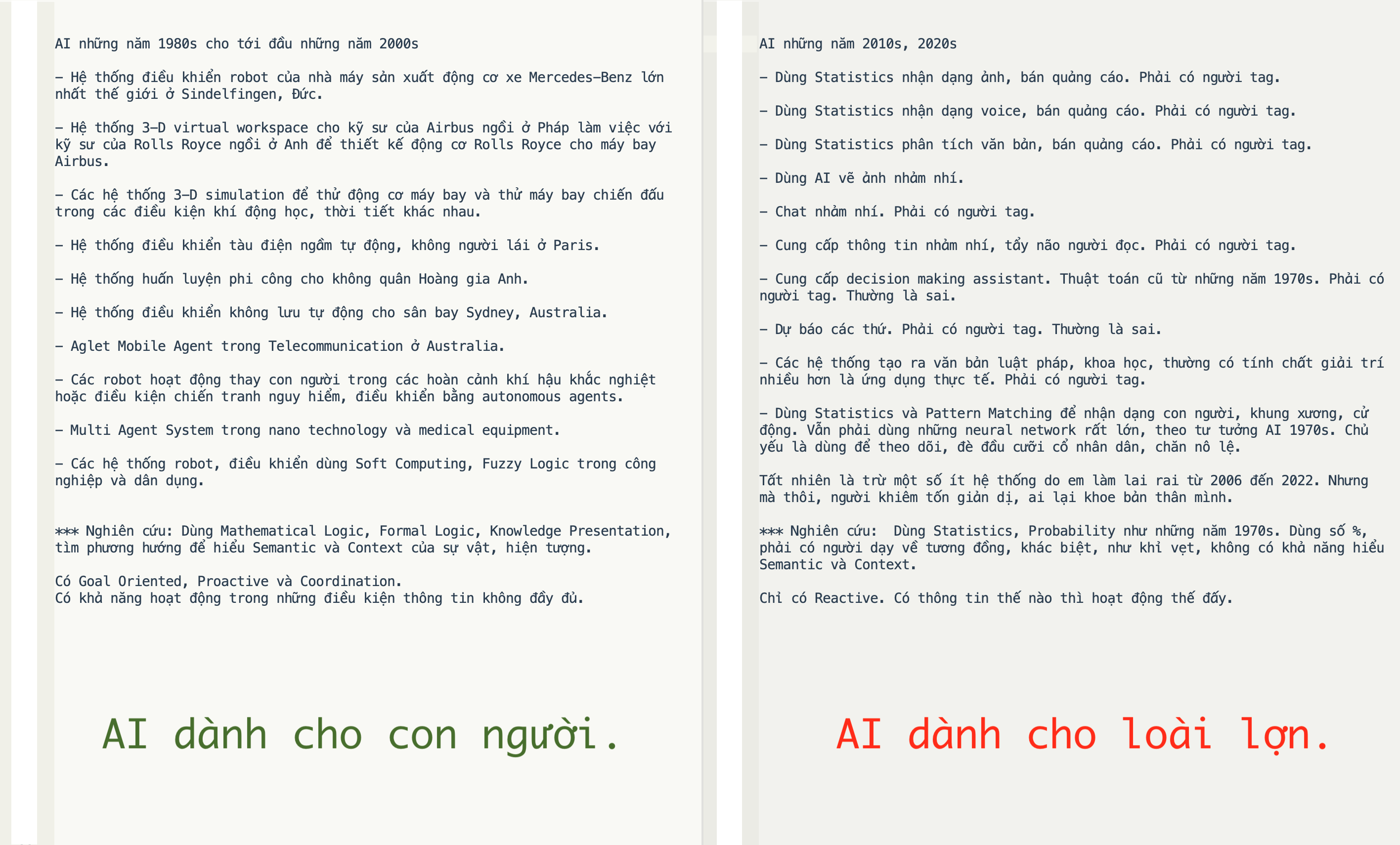 3. Đã có một thời kỳ ngành Trí tuệ Nhân tạo đi tìm hướng biểu diễn tri thức, xây dựng nền tảng khoa học tử tế, nhưng vào khoảng hai chục năm nay, bọn trọc phú dùng tiền thô bỉ hoá khoa học đã đẩy ngược AI trở lại thời dùng Statistics, cứ tưởng có đủ nhiều data là máy tính thành thông minh.