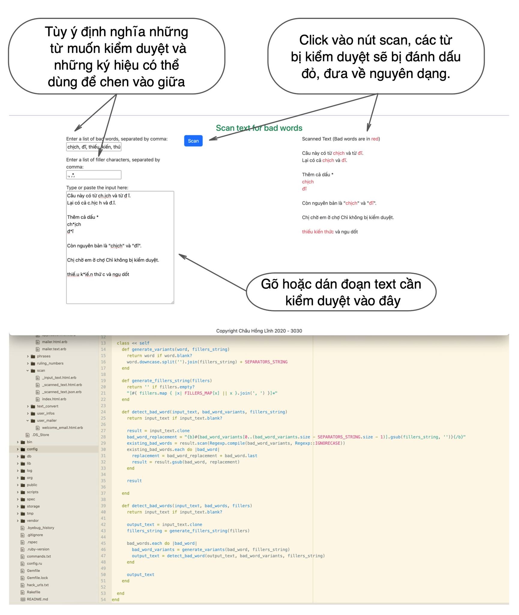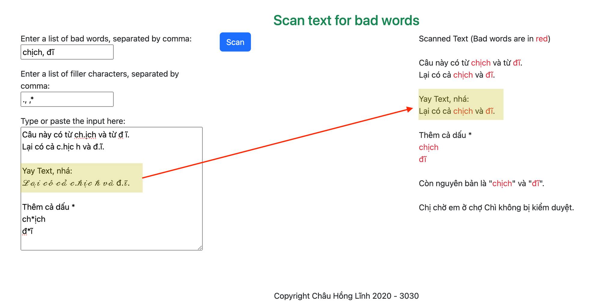 1. Về mặt lập trình mà nói, chỉ cần dưới năm chục dòng code, không cần phân tích Syntax Token, không cần hiểu Semantic, không cần AI, chương trình có thể phát hiện từ muốn kiểm duyệt dù viết dưới bất cứ hình thức nào.